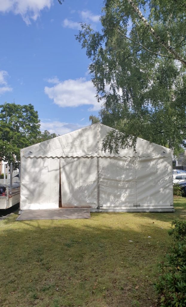 Beplanung: PVC-beschichtetes Polyestergewebe, schwer entflammbar nach DIN 4102 B1